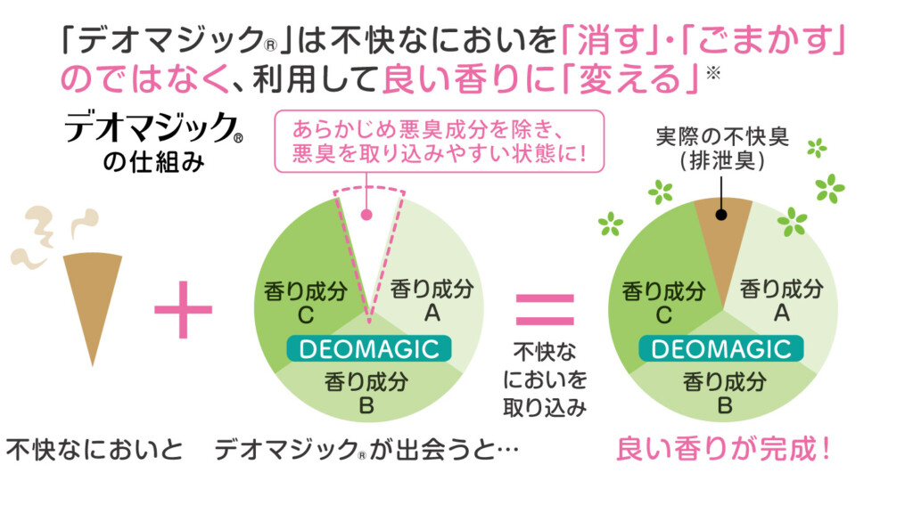 しかし、デイリーデオワイプは、不快なニオイを「消す」「ごまかす」のではなく、利用して良い香りに「変える」、シキボウ株式会社が開発したデオマジックと呼ばれる消臭技術を取り入れています。