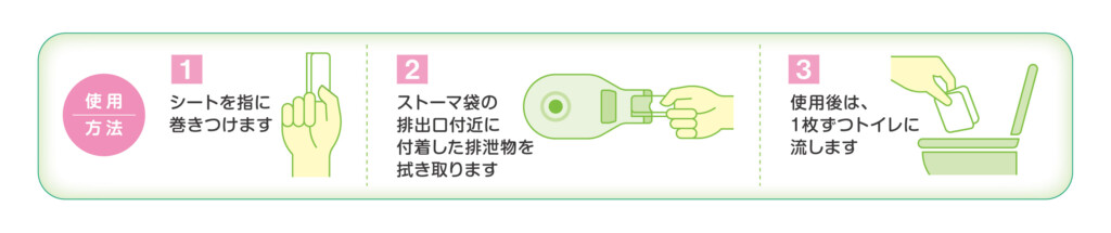 商品はウェットシートになっており、ストーマ袋の排出口を拭き取った後は、トイレットペーパー同様そのままトイレに流せます。