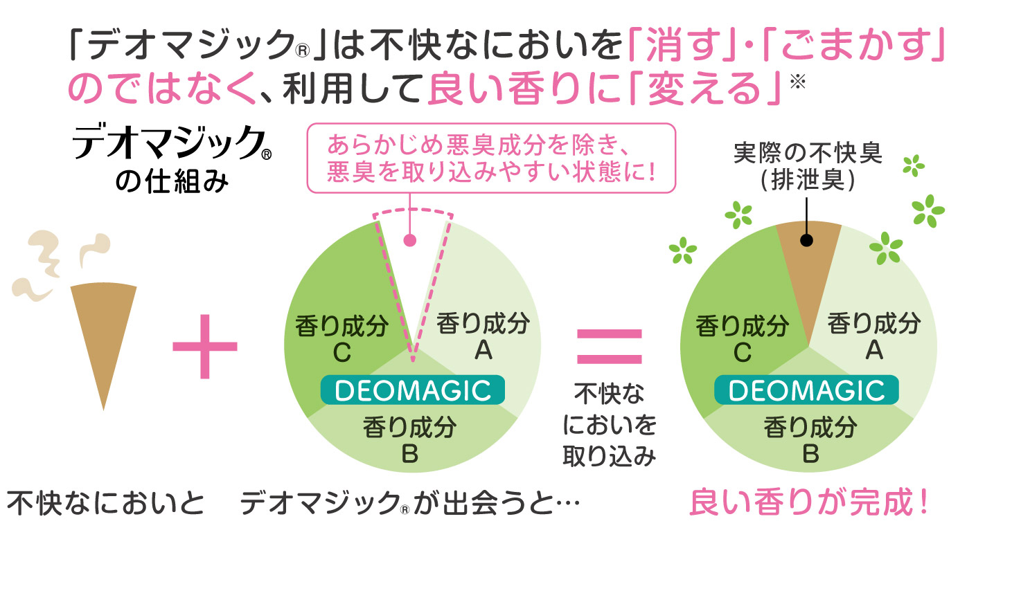 香水の仕組みを利用し、悪臭をうまく取り込み、いい香りに変えます。あらかじめ「不快な臭い成分を除いた香り」を作り、あとから不快な臭いを取り込むことで良い香りに変化させる、発想の転換から生まれた消臭技術。