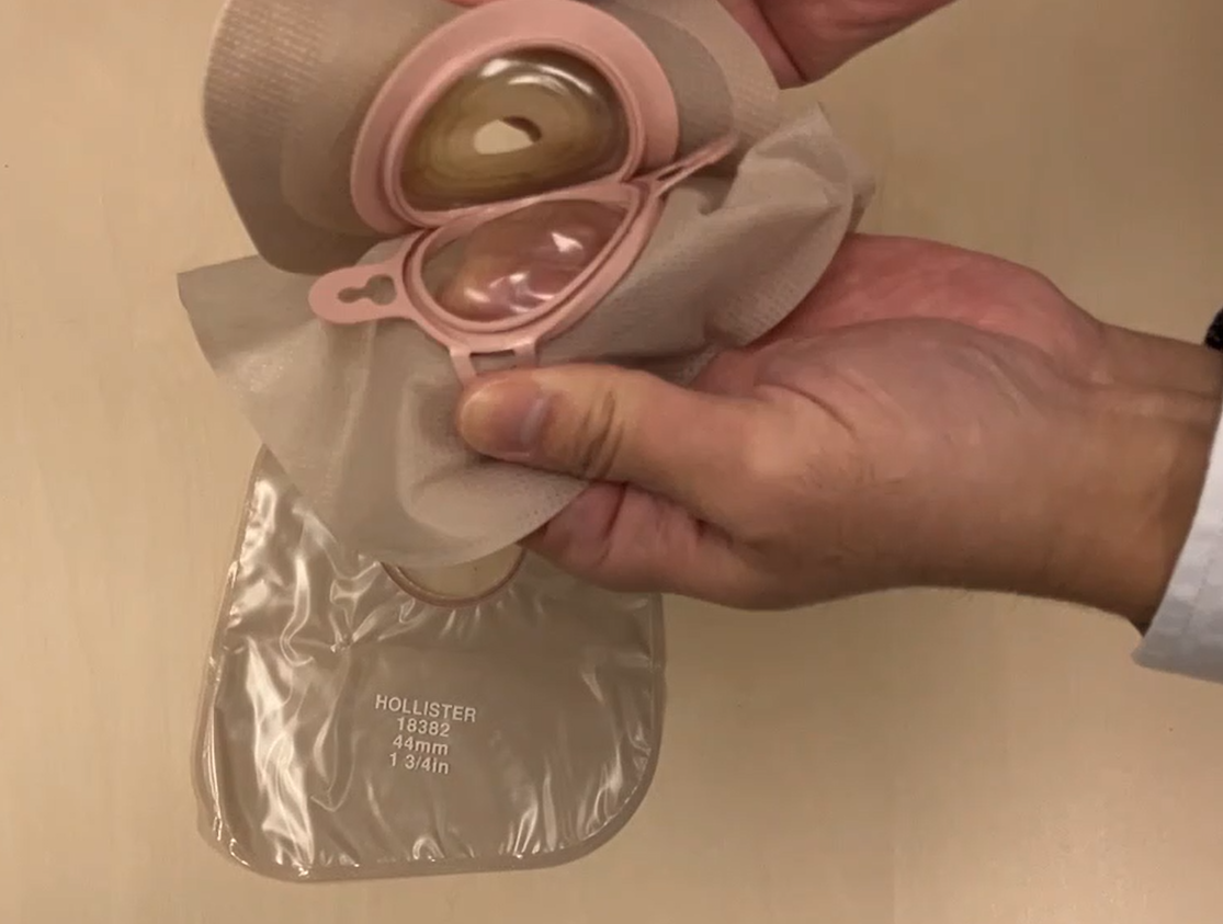 お腹に装具を貼る粘着部分の面板と、排泄物を溜めるストーマ袋が分離する装具です。