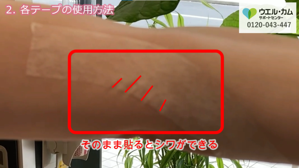 ちょっとしたコツではがれにくく、テープのつっぱり感も軽減できます。引っ張るちからが弱くなると皮膚への負担が軽減します。