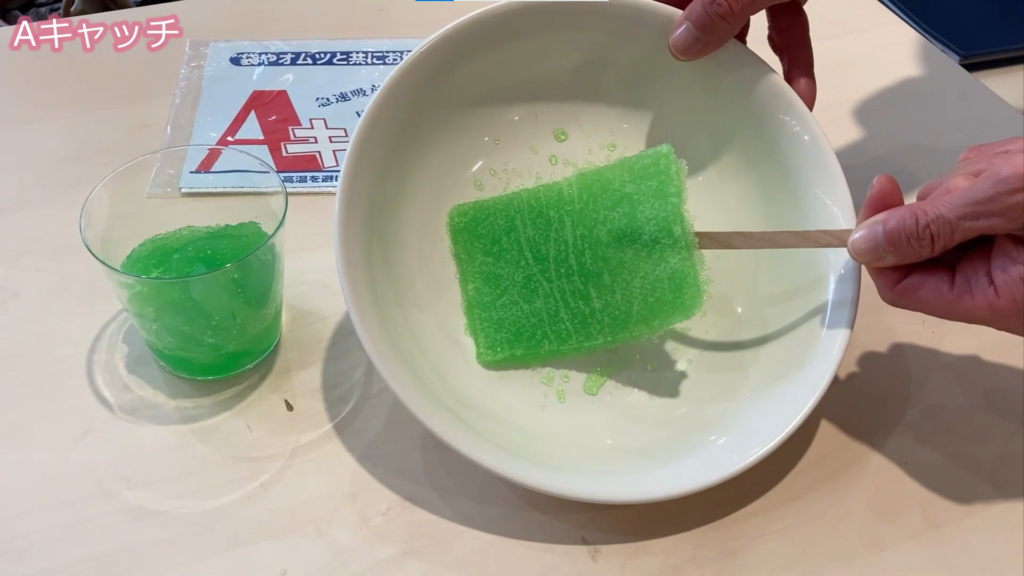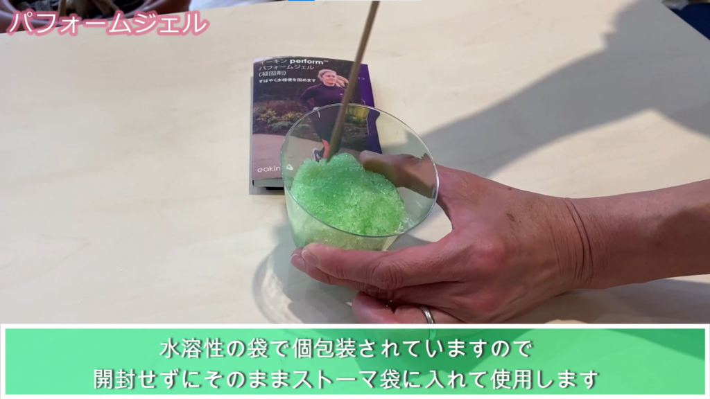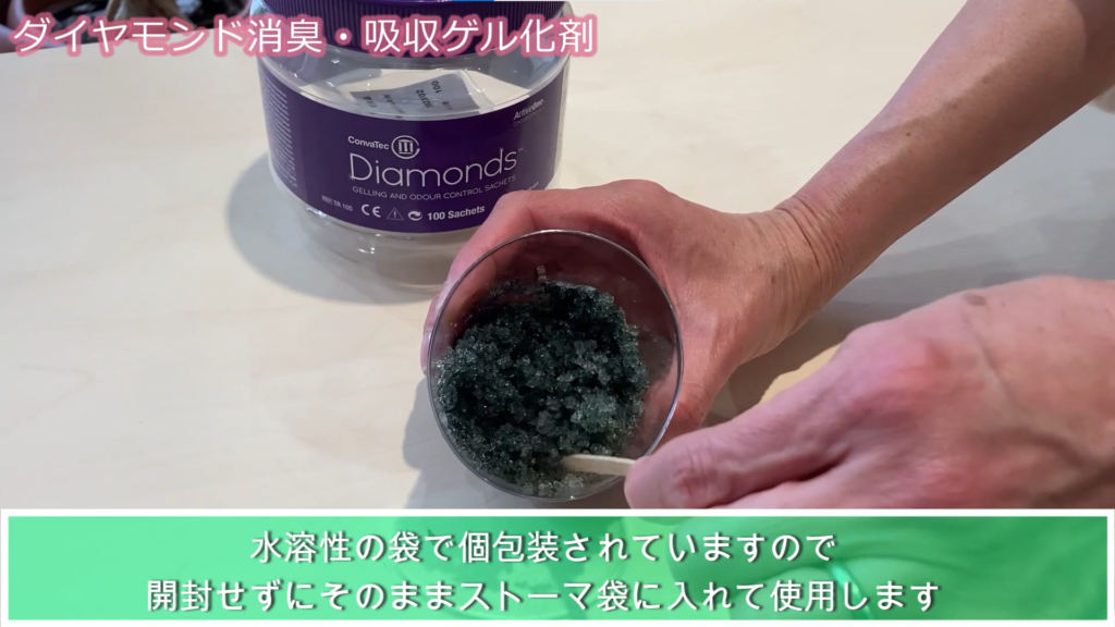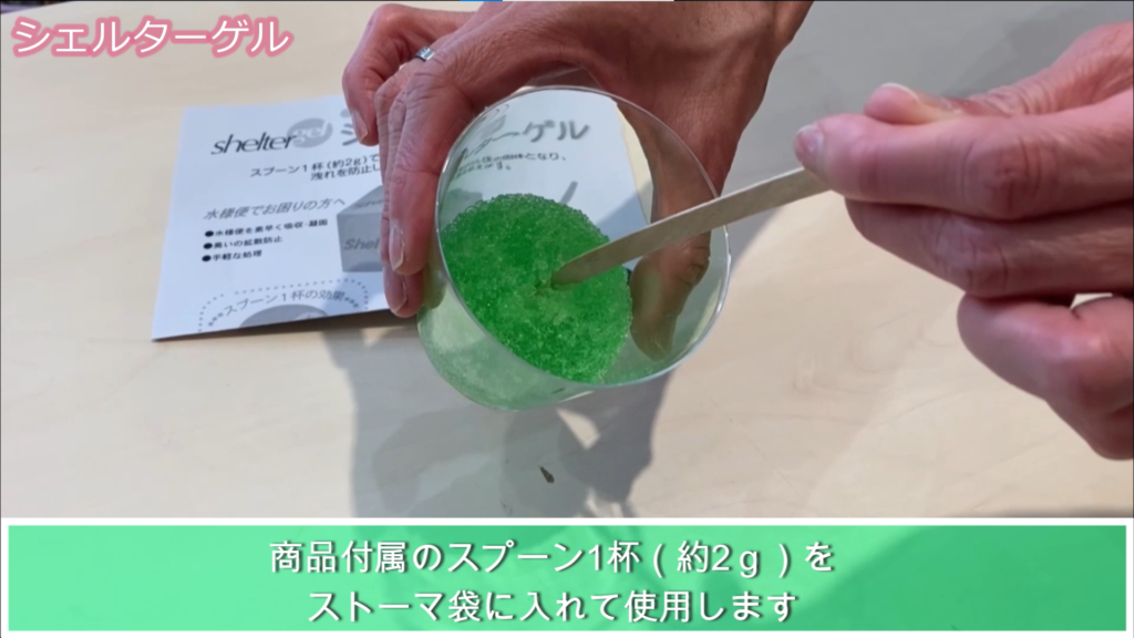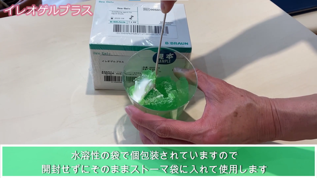 ストーマ袋の中に入れておくことで水溶性のものを吸収し、数分でゼリー状にしてくれます。