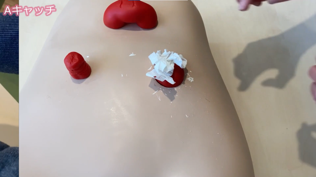 カットした後、Aキャッチは少しくしゅくしゅと丸めていれたほうが、よりストーマ上に置きやすくなりますし、ストーマ袋の排出口から中に入れやすくもなるでしょう。